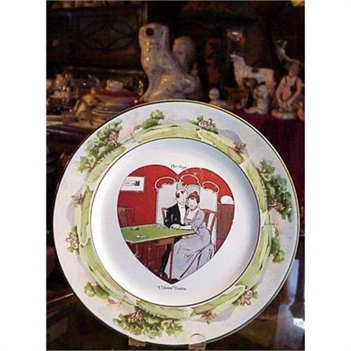 CHARMNING AND UNIQUE ANTIQUE PLATE, MADE BY WARWICK WARE OF ENGLAND RD nO 516465, SIGNED BY VICTOR VENNER, AND ENTITLED:"BRIDGE - A "CLOSE" GAME", EXCELLENT CONDITION, FREE FROM CHIPS OR CRACKS, BUT FOR GLAZE CRAZING AND THE RED BACKGROUND SHOWS A BIT AGE AND USE as per picture.MEASURES 10" IN DIAM.US BUYER TO PAY 8.50 FOR SHIPPING PLUS INSURANCE.THANK YOU!