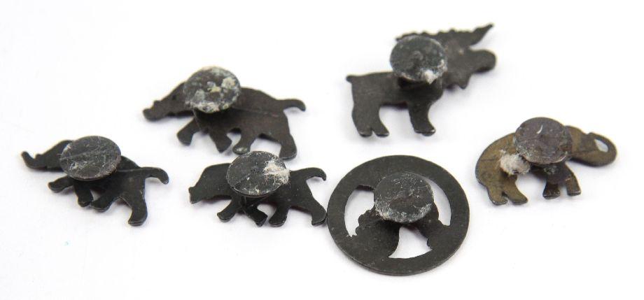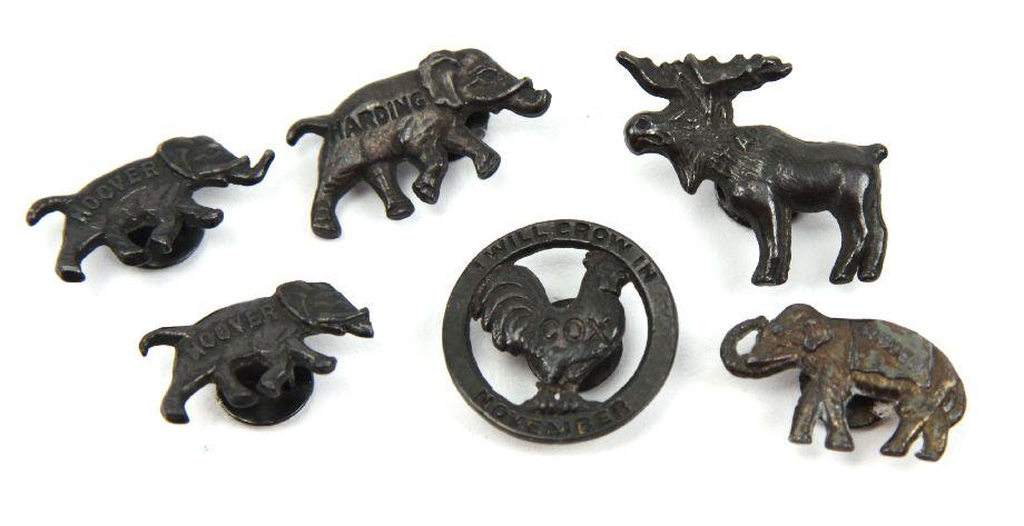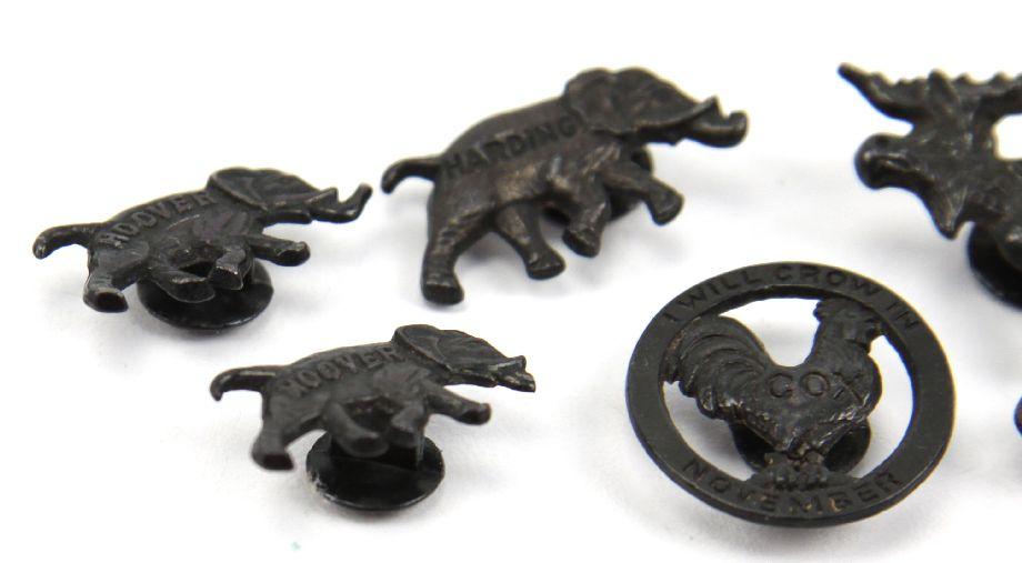 Grouping includes 2 Hoover elephant pins, 1 Cox rooster pin, 1 Lowden elephant pin, 1 Harding elephant pin and 1 P.T. Alton Bull Moose pin.