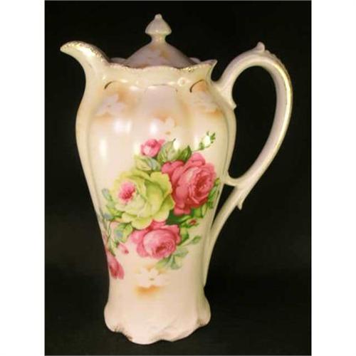 Beautiful tall Bavarian chocolate pot decorated with lush roses. The chocolate pot measures 9 3/4 inches high being about 6 3/4 inches across. This is a decorative pot in very nice condition with some gold loss but in an even manner. Lovely to display and add to your collection of German porcelain. Very Romantic and Shabby Chic!