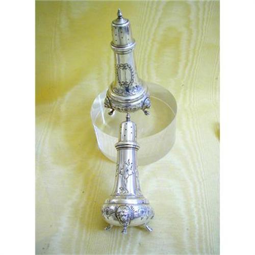 A PAIR OF FINE STERLING SILVER CASTERS / SHAKERS ~ STANDING ON 3 LION HEAD FEET / THE PAIR ARE FINELY HAND-CHASED AND VERY ELEGANT / 6" TALL / MINT CONDITION // TROY 10.014 OZ / STAMPED: B&M STERLING / HAND CHASED ( BALDWIN,MILLER CO,INC. INDIANAPOLIS, INDIANA ) Burton Brook Farm Antiques