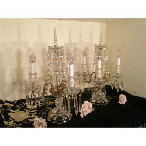 WE PRESENT TO YOU THIS ANTIQUE PRE 1900 PAIR OF CANDLABRUM THREE LIGHT TABLE TOP CHANDLELEIRS. I RECENTLY AQUIRED THIS PAIR AT A LOCAL RENO NV. ESTATE SALE.WANTING TO KNOW THE HISTORY,I ASKED. THE INFORMATION IS THAT A "HOWADR REIGEL" WAS AN INDUSTRIALIST, WHOM A TOWN WAS NAMED AFTER IN PENNSYLVANIA, IN WHICH THE PAIR OF CANDLEABRUM CHANDLEIRS ORIGINALLY CAME FROM HIS ESTATE. SO FROM ONE ESTATE TO ANOTHER AND SOLD. SOLD BY THE DAUGHTER OF THE WOMAN WHO INHEIRITED THEM FROM THE REIGEL ESTATE. FLUORESES UNDER BLACK LIGHT E.A.B.P. THE SHIPPING ON THIS PAIR WILL BE QUOTED AFTER SALE OF SUCH.I WILL SAVE YOU AS MUCH AS POSSIBLE BY CAREFULLY DISSASYBLY AND ADEQUATE PACKING. THEN I WILL HAVE THEM WEIGHED AND QUOTED INCLUDING INSUREANCE.
