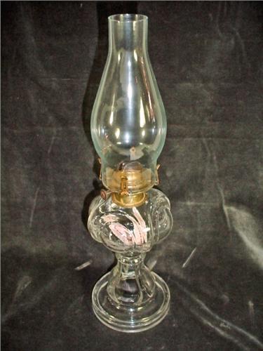 ANTIQUE PRESSED GLASS OIL LAMP WITH CLEAR HURRICANE SHADE. 19" X 4.75".