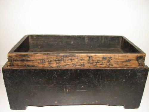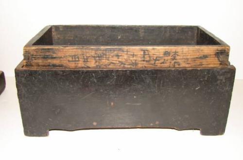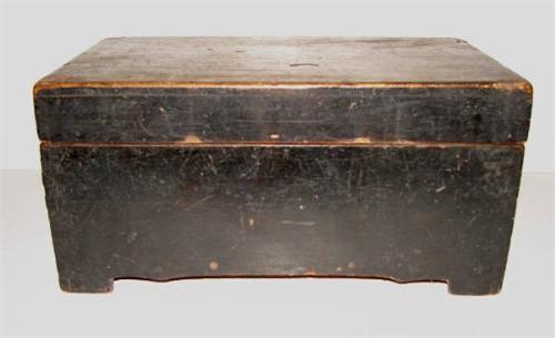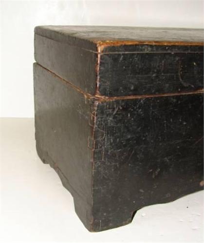 ANTIQUE PRIMITIVE PAINTED BLACK DOCUMENT BOX WITH DOVETAILED CONSTRUCTION AND CARVED SKIRT. Lift-out tray. 7.25” H x 14.25” W x 8” D.