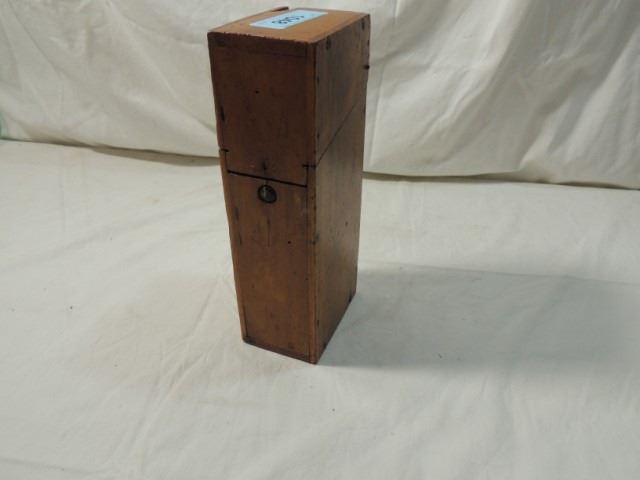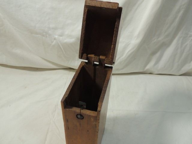 NOT SURE WHAT USED FOR. PRIMITIVE ANTIQUE STORAGE BOX WITH SWING HINGED LID. STANDS 10.5" TALL. 4.25" X 3". EXCELLENT CONDITION. AS SHOWN. BEAUTIFUL PIECE.