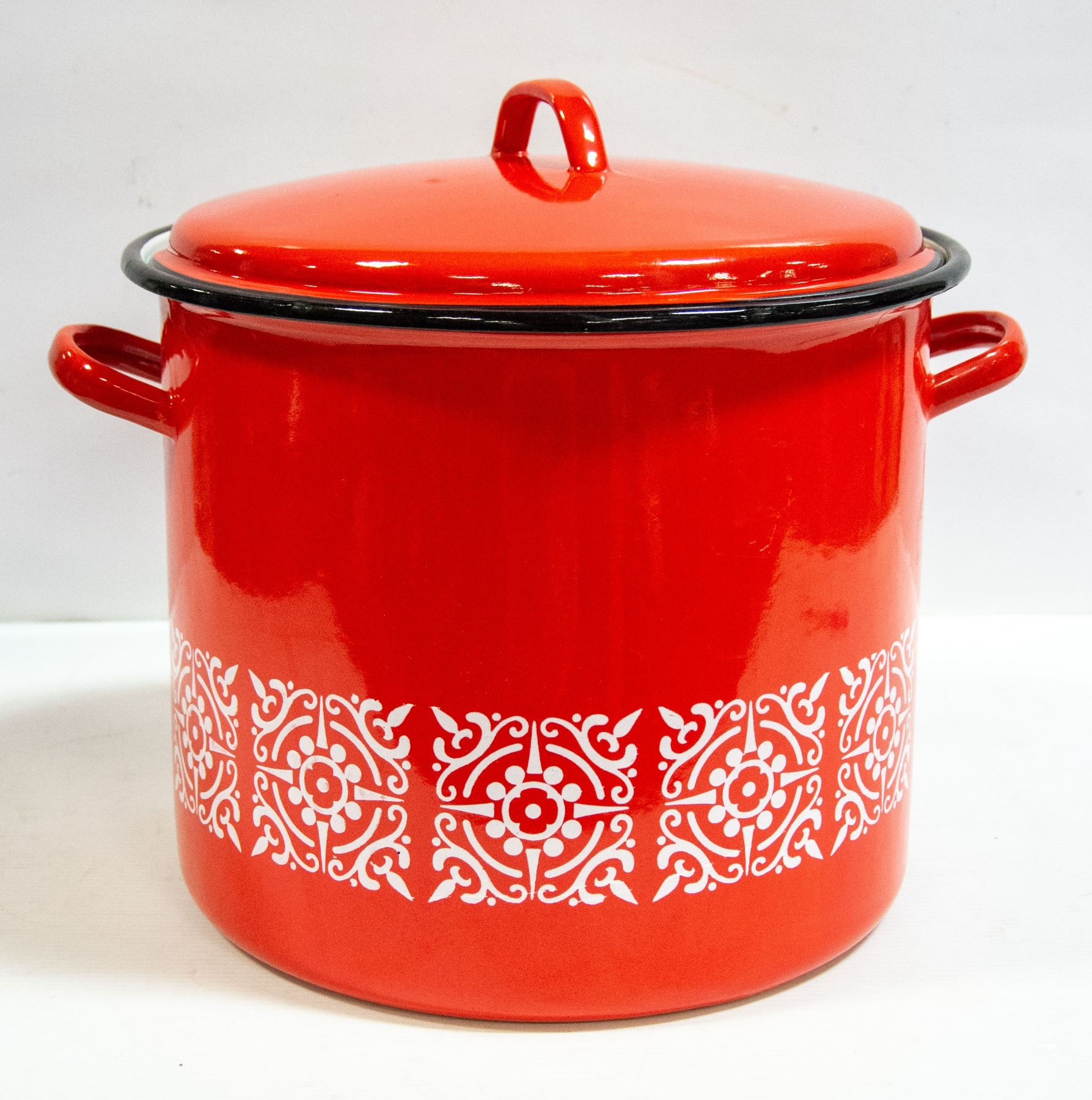ANTIQUE RED ENAMEL COOKING POT WITH LID
