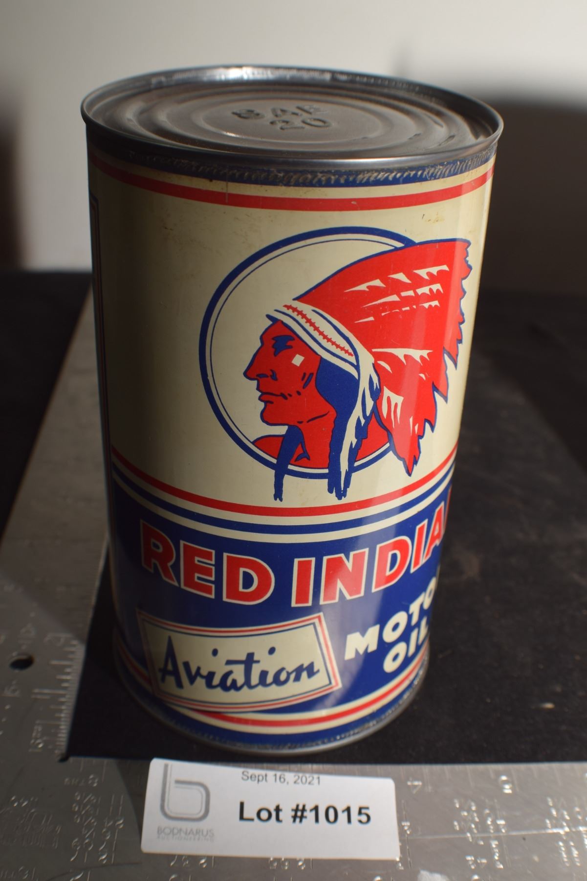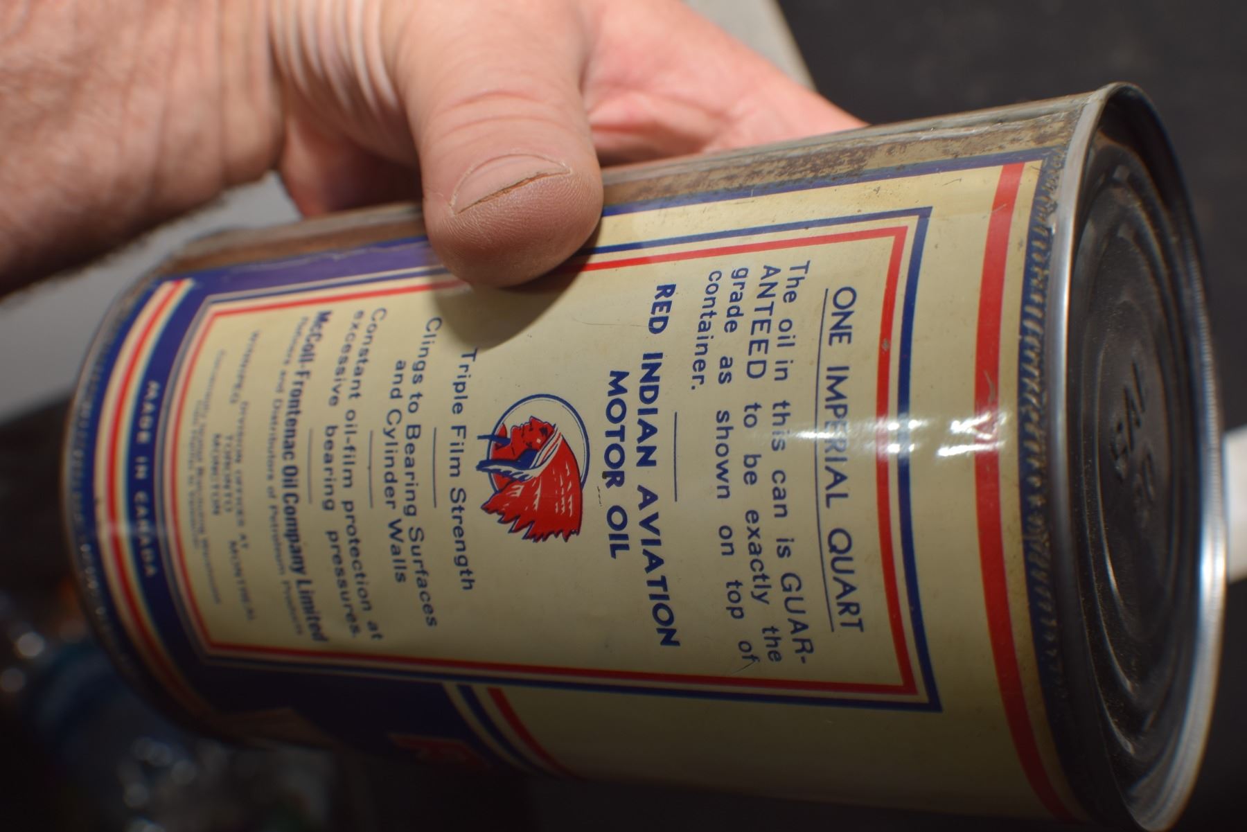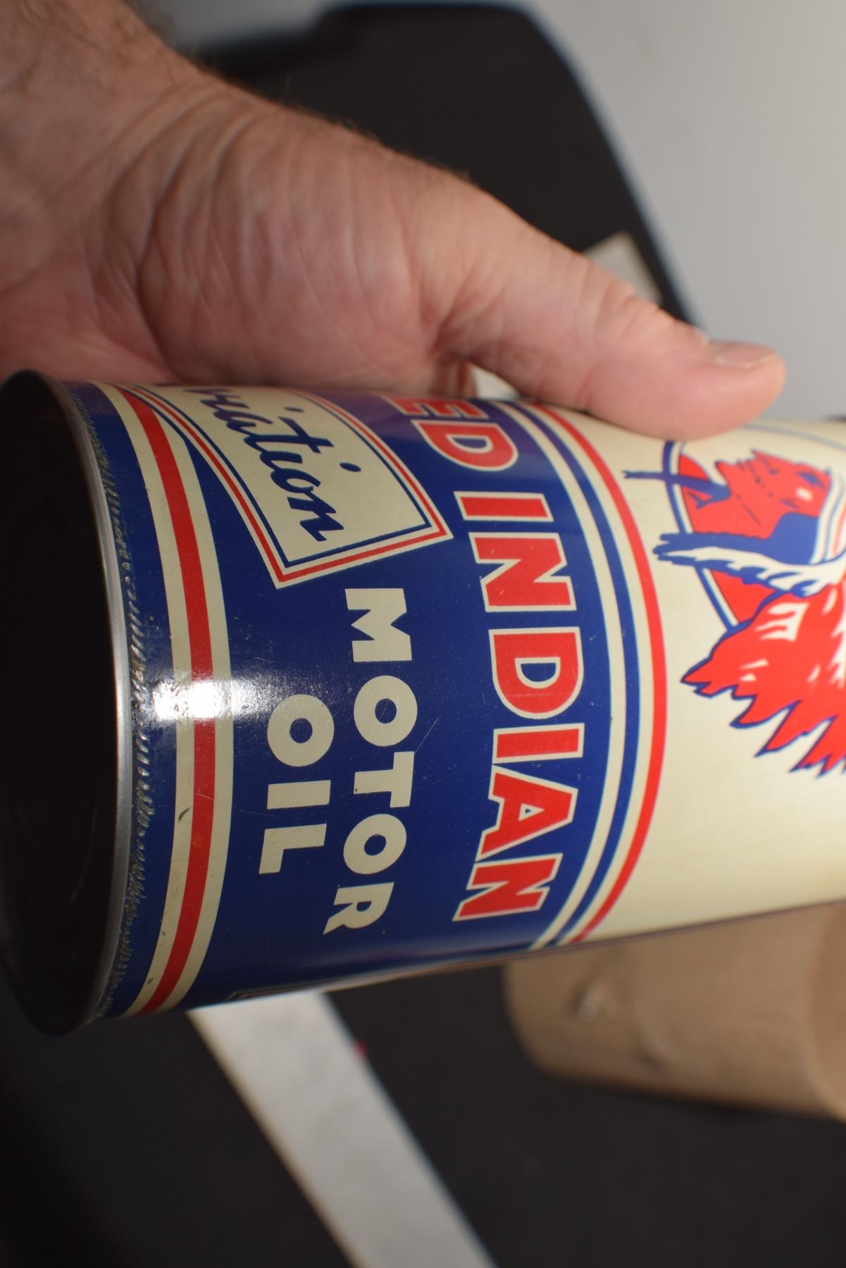 ANTIQUE RED INDIAN QUART OIL TIN , THIS IS A RE-ROLL NOT A NEWER WRAP