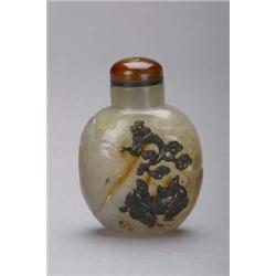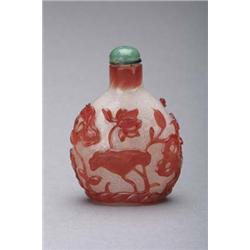 Antique, finely carved and detailed, Chinese red overlay on snowflake Peking glass snuff bottle of flattened globular form with butterfly and floral designs, late 19th Century, aventurine quartz stopper; H: 2 1/2"