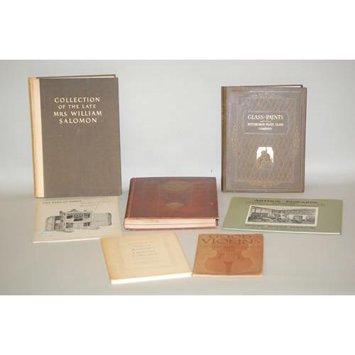 ANTIQUE REFERENCE. A Group of 7 Volumes as Listed. Very Good condition. ***Frederick K. and Margaret R. Barbour's Furniture Collection - SIGNED (1963) The CT Historical Society. With glasssine wrapper, no slipcase. ***Arthur Edwards - The Stratford Galleries - Genuine Antique Furniture (price list laid in) (nd) London, soft cover. ***The King of Desks - Wooton's Patent Secretary by Betty Lawson Walters (1969) Smithsonian. Soft cover, ex-lib. ***Important Eighteenth Century French Art Collection Belonging to the Late Mrs. William Salomon - Auction Catalogue (1928) NY: American Art Assoc. Inc. Half paper vellum, hard cover, photographic plates. ***Good Violins, Bows and Accesories (1938) NY: Rudolph Wurlitzer Co. Soft cover, glossy pages, photographs throughout. ***May & Malone Incorporated Presenting the Red Book for 1928, Chicago. Glossy pages, original order forms. First part of book used as a scarpbook. ***Glass - Paints, Varnishes and Brushes - Their History, Manufacture and Use (1923) Pittsburgh Plate Glass Co. Glossy pages, includes tissue guarded samples.