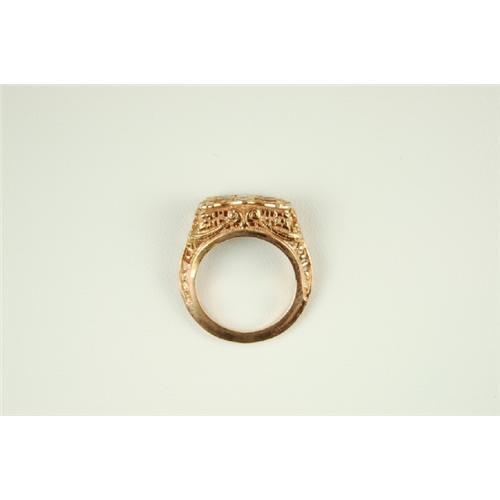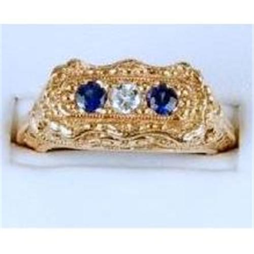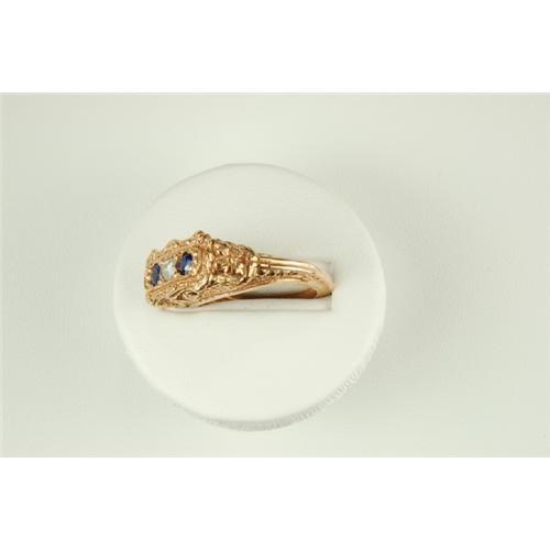 Antique Style 14k ROSE GOLD Ring featuring a center DIAMOND = .11 Cts. with a Genuine Blue SAPPHIRE set each side. The Sapphire Total Weight = .30 Carats. There is exquisite Filigree work surrounding the gemstones. This ring is a Size 6 and I can resize it for you.