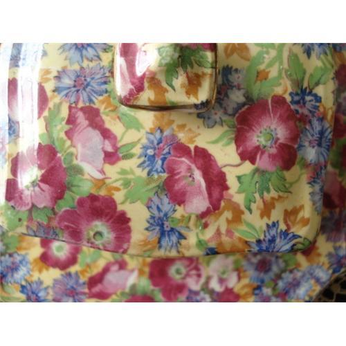 What a great find! This is an original old Chintz covered butter dish by Royal Winton in the fabulous pattern ROYALTY. The set is in very fine condition, with the bottom dish having a couple of very light discoloration as is normal for butterdishes of this kind. It displays beautifully and is a gem of a find! Add it to your collection of antique chintz !