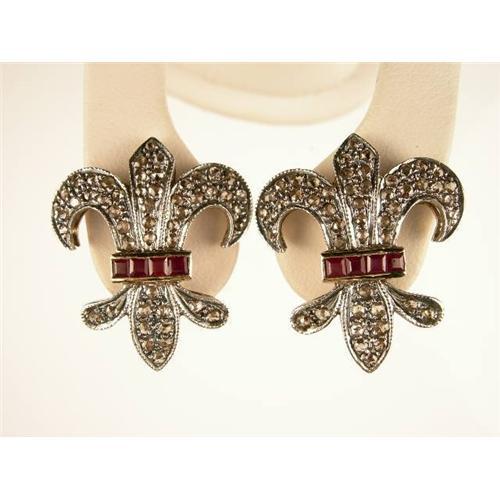 This pair of ANTIQUE Style Earrings are an Accurate and Authentic copy of a pair from the GEORGIAN Period CIRCA 1800 and they are in MINT condition. The Earrings are in the FLEUR DE LIS pattern and they feature ROSE CUT DIAMONDS and RUBIES. The DIAMOND TOTAL WEIGHT = 1.50 CARATS and the RUBY TOTAL WEIGHT = .65 CARATS! The ROSE CUT DIAMONDS and RUBIES are Authentically set in Silver as is typical of Georgian Jewelry and the backs of the Earrings are 14k Yellow GOLD. The backs are 14k Gold posts for pierced ears. The Earrings measure 1 1/4 inch x 1 inch, and they ARE stunning!