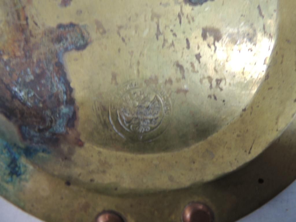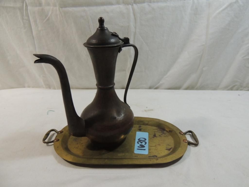 VNTAGE COPPER AND BRASS TEA POT AND TRAY. EUROPEAN GENUINE RUSSIAN MARKINGS STAMPS IN METAL OVER 100 YEARS OLD AS SHOWN SEE PHOTO FOR MORE DETAILS.