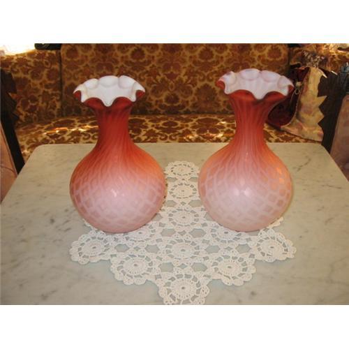 HERE ARE TWO ANTIQUE MOTHER OF PEARL DIAMOND QUILTED SATIN GLASS VASES. THE VASES ARE BLOWN AND NOT IDENTICAL BUT COULD BE SHOWN AS A PAIR IF THEY WERE ON A MANTEL A LITTLE DISTANCE APART. ONE MEASURES 8.0" AND THE OTHER 8.25". THEY FEATURE A PEACH TO FADING PINK SHADE WHICH IS GORGEOUS. GROUND PONTIL AND PROBABLY MANUFACTURED BY MT WASHINGTON. THEY ARE MADE OF CASE GLASS INSIDE AND SATIN GLASS OUTSIDE. EXCELLENT CONDITION: NO SCRATCHES CHIPS OR CRACKS. DARK SPOTS WHICH APPEAR IN SOME IMAGES ARE ONLY PHOTO SHADOWS AND ARE NOT REAL.
