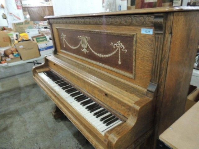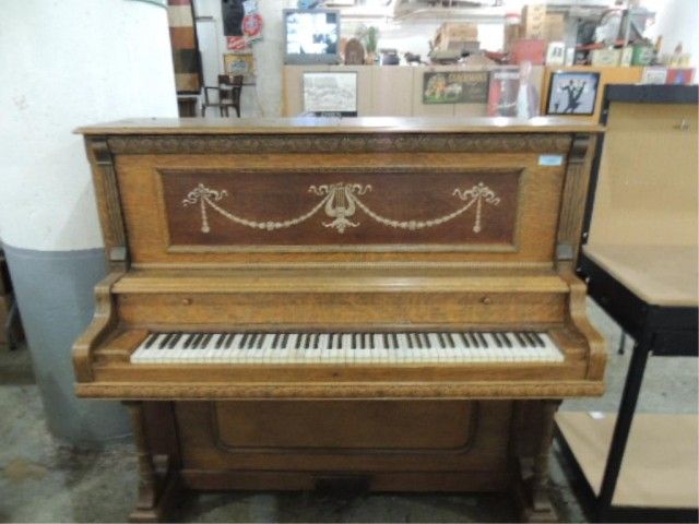ANTIQUE 1899 SCHUMANN #10591 QTR SAW OAK UPRIGHT PIANO. BEAUTIFUL PIANO CABINET ON THIS PIANO. THE DETAIL IS WONDERFUL. AS SHOWN. VIEW PICTURE FOR DETAIL.