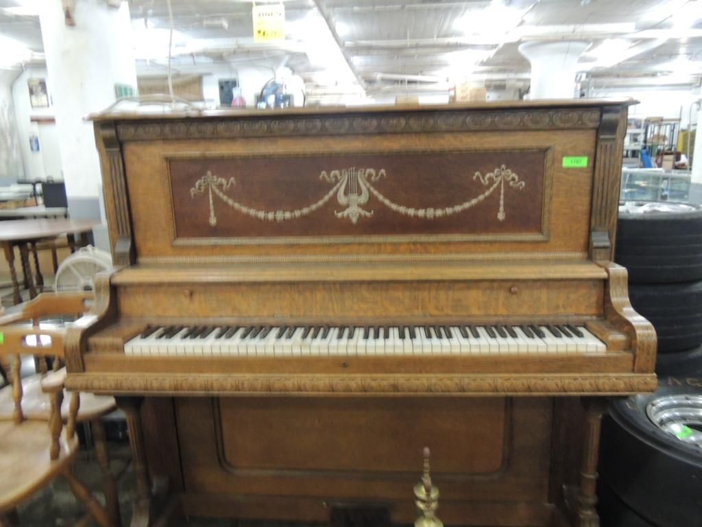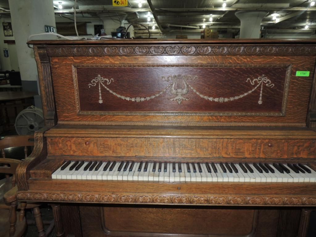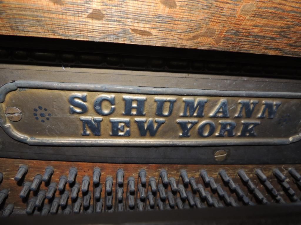 ANTIQUE 1899 SCHUMANN #10591 QTR SAW OAK UPRIGHT PIANO. BEAUTIFUL PIANO CABINET ON THIS PIANO. THE DETAIL IS WONDERFUL. AS SHOWN. VIEW PICTURE FOR DETAIL.
