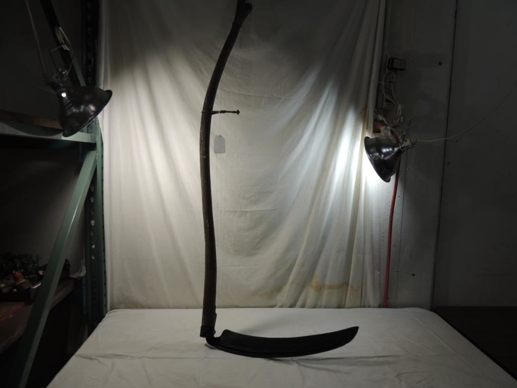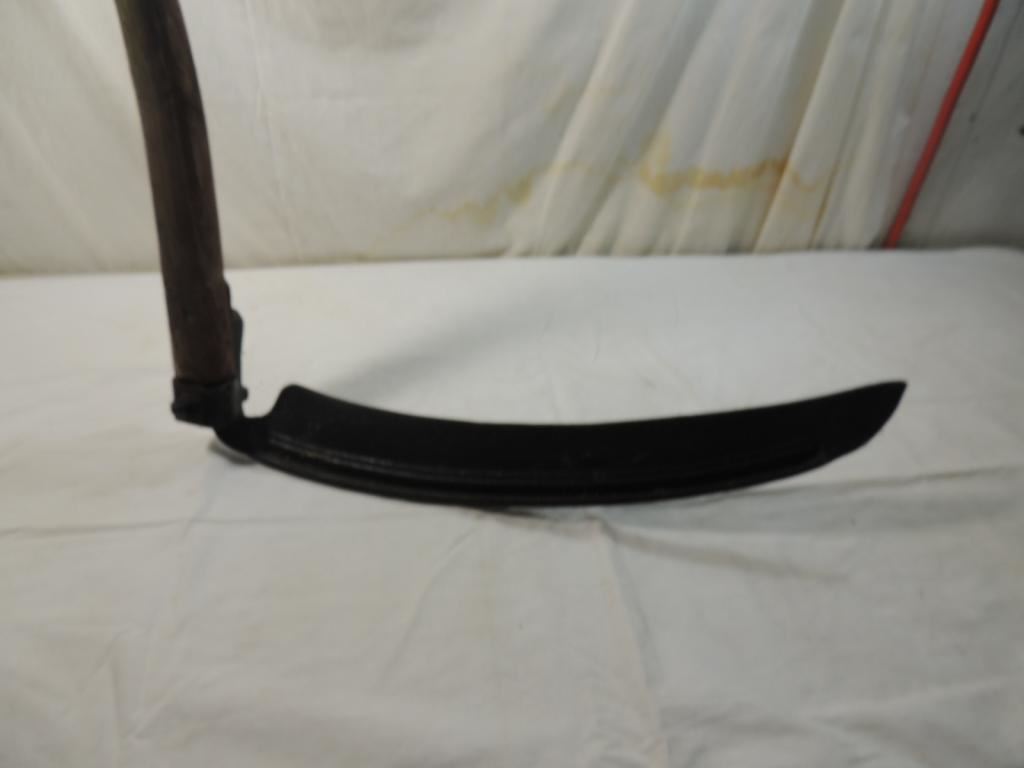 ANTIQUE SICKLE BLADE KNIFE REAPER SCYTHE, VINTAGE FARM PRIMITIVE, OLD WOOD HANDLE AS SHOWN SEE PHOTO FOR MORE DETAILS.