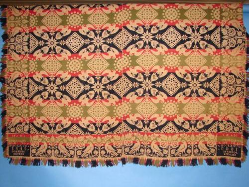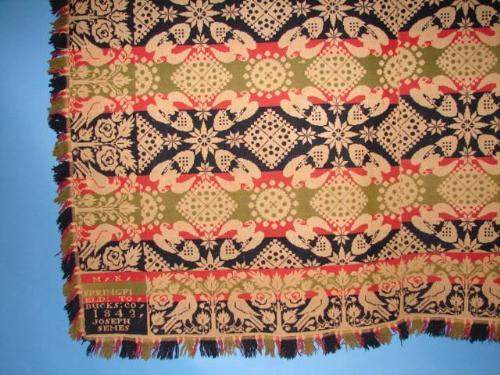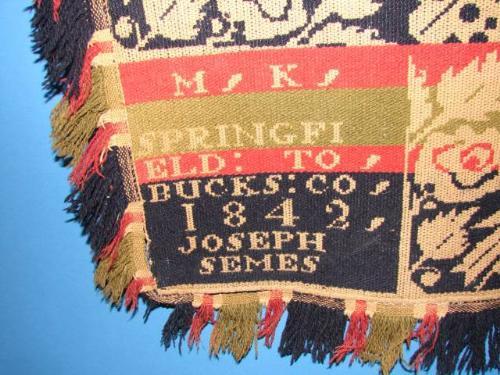 ANTIQUE SIGNED 3-COLOR COVERLET. Signed “M.K. – SPRINGFIELD TO – BUCKS COUNTY – 1842 – JOSEPH SEMES”. Decoration of doves.