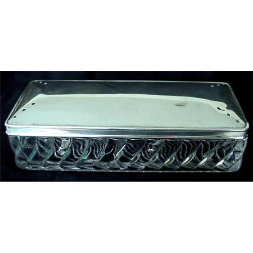 Unique old dresser / vanity box made of Baccarat glass and fine silver plate. Specifically made to store toothbrush. Measures: 8 1/8' long, 3 3/8" wide and 2 1/2" high. Finest Baccarat crystal with ridges on the bottom to hold your toothbrush above the surface and allow water to dry. Beautiful quality slkightly domed silver plated lid with pierced holes to allow moisture to escape. This piece is signed with raised "BACCARAT" on one side and "DEPOSE" on the other. COndition: very good. There is a small strawmark on one side, but this is evidence of the age of the piece and certainly not to be seen as damage of any sort.