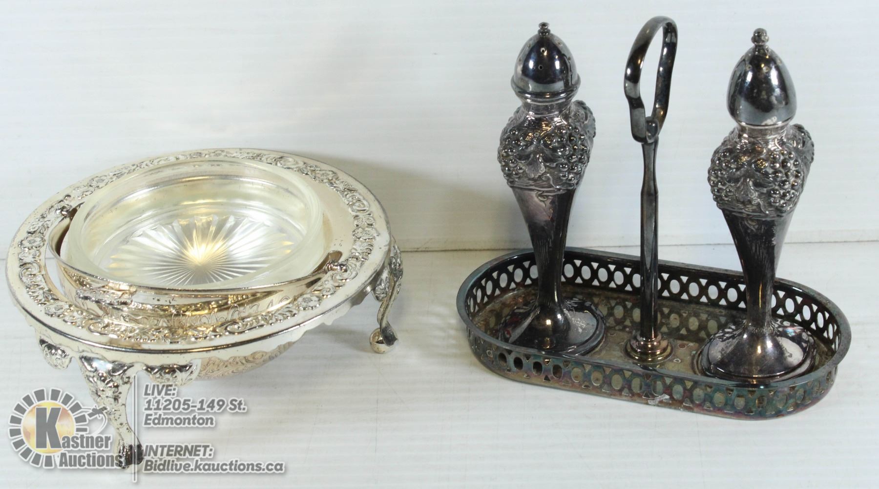 CAVIAR DISH E.P ON STEEL MADE IN ENGLAND W/SALT & PEPPER SHAKERS ON STAND E.P. LEAD #1025