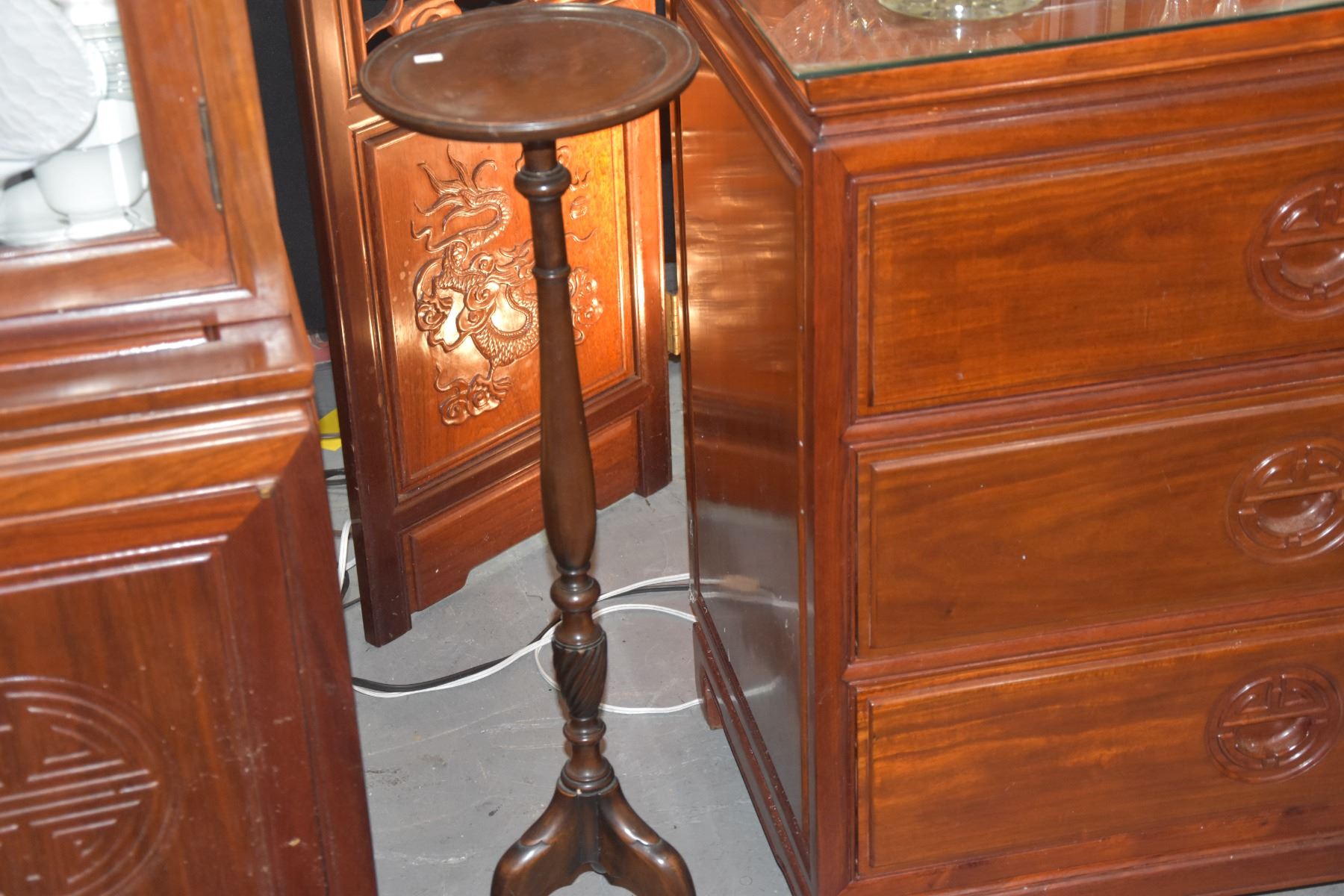 ANTIQUE SMALL WOOD TRADE SAMPLE ROUND TABLE & WOOD TRIPOD CANDLE STAND (2 PCS)