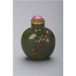 Antique and well-hollowed, Chinese green and red jasper snuff bottle of flattened globular form with well-detailed fish and lotus flower design, good use of natural inclusions, with ruby and bone stopper, 19th Century; H: 2 1/2"