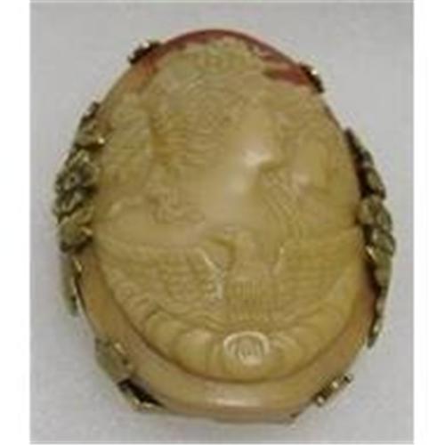 This is a highly unusual carved Soapstone Cameo in high relief Day and Night Goddesses. As with most Day and Night Goddess Cameos, an owl is depicted within the cameo. Here, we have an Eagle in place of the Owl representative of a patriotic theme. Perhaps this Cameo was carved at the beginning of WW1. Regardless it is quite unusual and unique compared to the abundance of Cameos offered today. This large Cameo is set in highly repousse and original Brass Frame