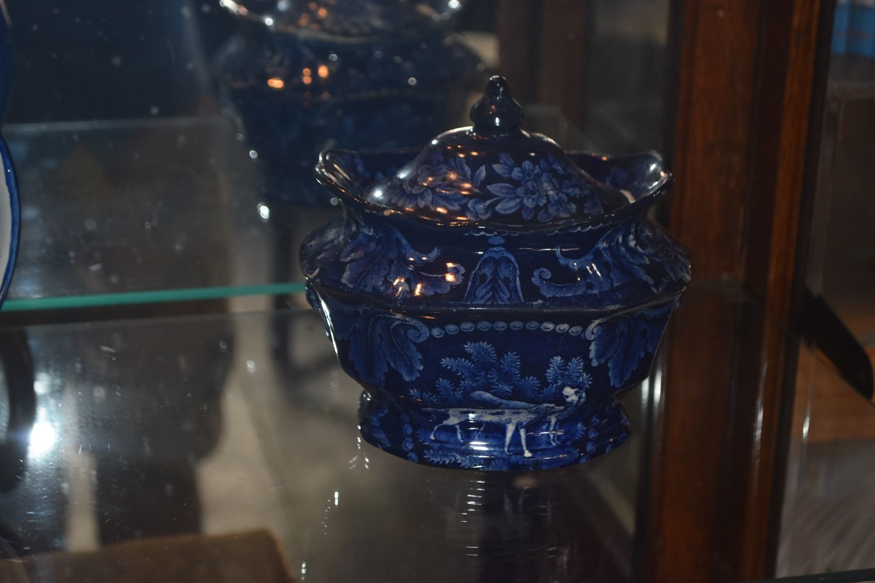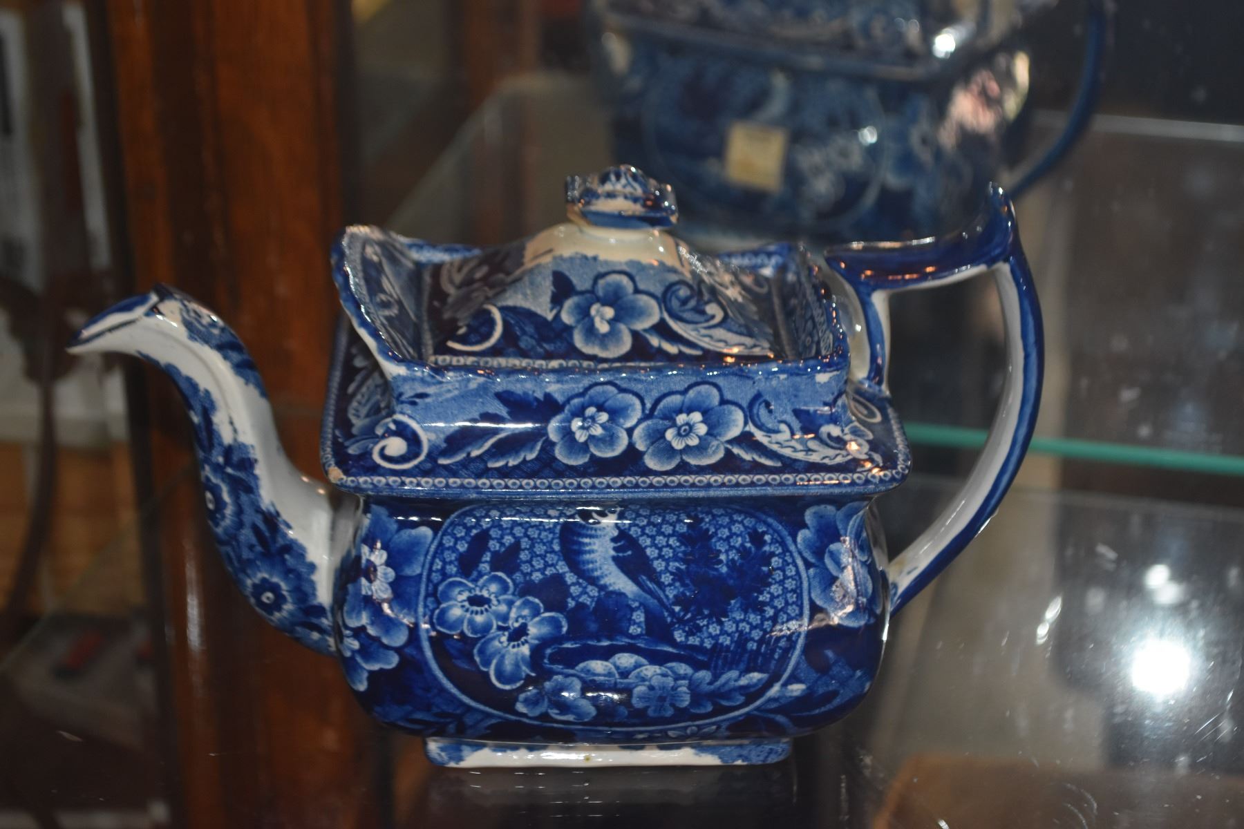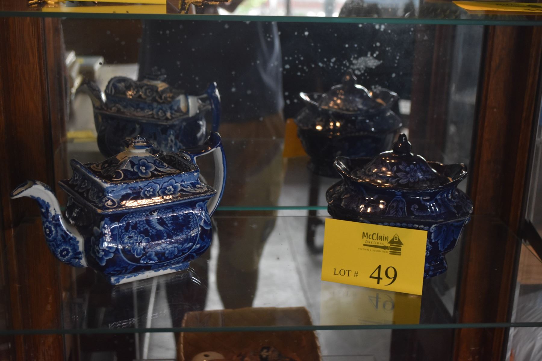 ANTIQUE STAFFORDSHIRE BLUE & WHITE TRANSFERWARE TEAPOT & COVERED SUGAR BOWL (2 PCS)