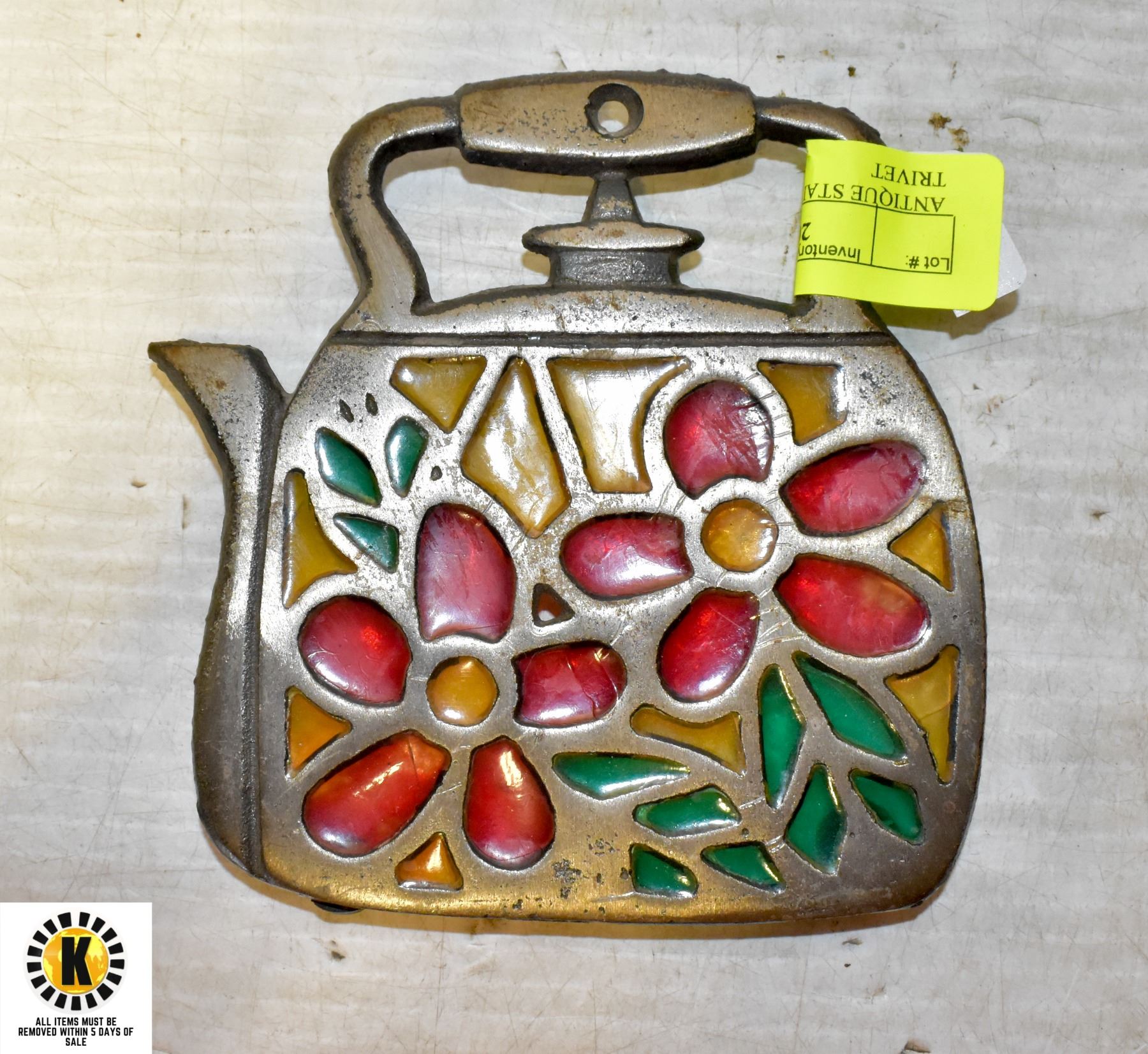 ANTIQUE STAINED GLASS TEA POT TRIVET