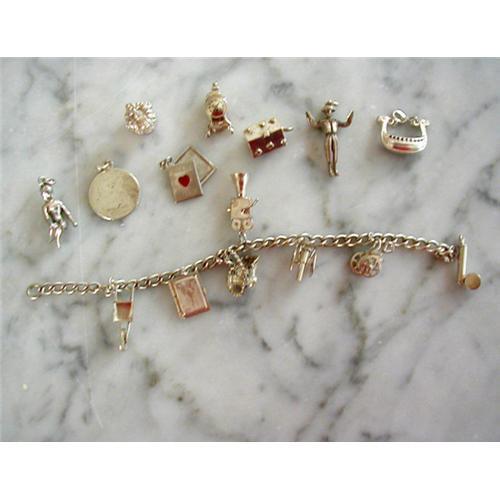 BURTON BROOK FARM ANTIQUES presents a sterling silver charm bracelet formed from the 1920's to 1950's with 7 charms and 8 loose charms. The charms on the bracelet are as follows: wheelbarrow with movable wheels, photo album that opens, woven silver basket, projector with movable handle, movable cannon, movable garden cart, movable pump / Loose charms: round disk stamped with Tiff. maker mark, matador, gondola, enamel marriage license that opens,bird house, bathing beauty & standing clock with swinging pendulum. All sterling & wonderful. The bracelet is missing a spring ring to close it.