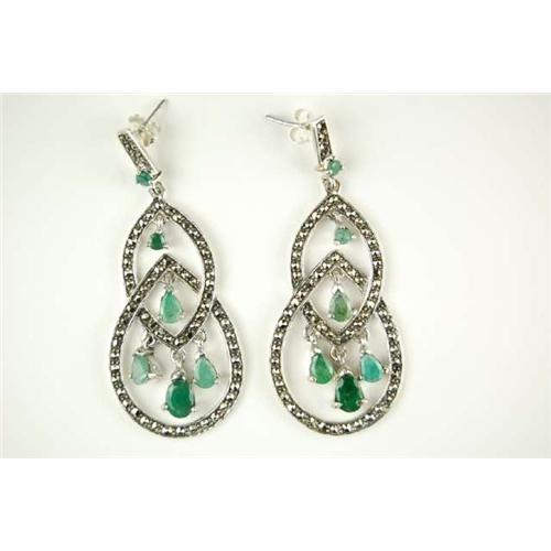This pair of Antique Style Earrings is an Authentic and Accurate copy of a pair of Earrings from the 1930s but THIS pair is in MINT condition! The earrings are Solid STERLING Silver and each is set with 5 Pearshaped EMERALDS with sparkling Marcasites as accent. The Earrings dangle 2 1/2 inches and they have post style backs for pierced ears.