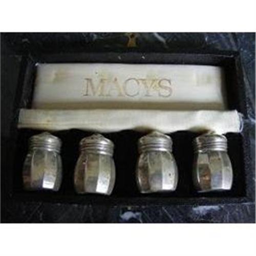 THIS IS A DARLING OLD MACYS STERLING SILVER SALT AND PEPPPER SET IN THE ORIGINAL MACYS PRESENTATION BOX. EACH SALT AND PEPPER MEASURES 1.5" TALL AND .5" AT BASE. ON THE BOTTOM OF EACH IS GSA STERLING. BOTH BOX AND SALT/PEPPERS ARE IN VERY GOOD CONDITION.