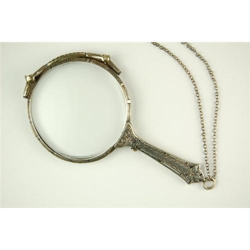 This STERLING SILVER LORGNETTE was made in the folding style and has exquisite engraving. This ANTIQUE LORGNETTE can be worn as bifocals hung around your neck on a silver metal chain and popped open whenever needed! The stem and case of these lens' are nicely finished with heavy engraving and flower cut outs. The lorgnette is 3-1/2" long and it IS in Excellent condition.