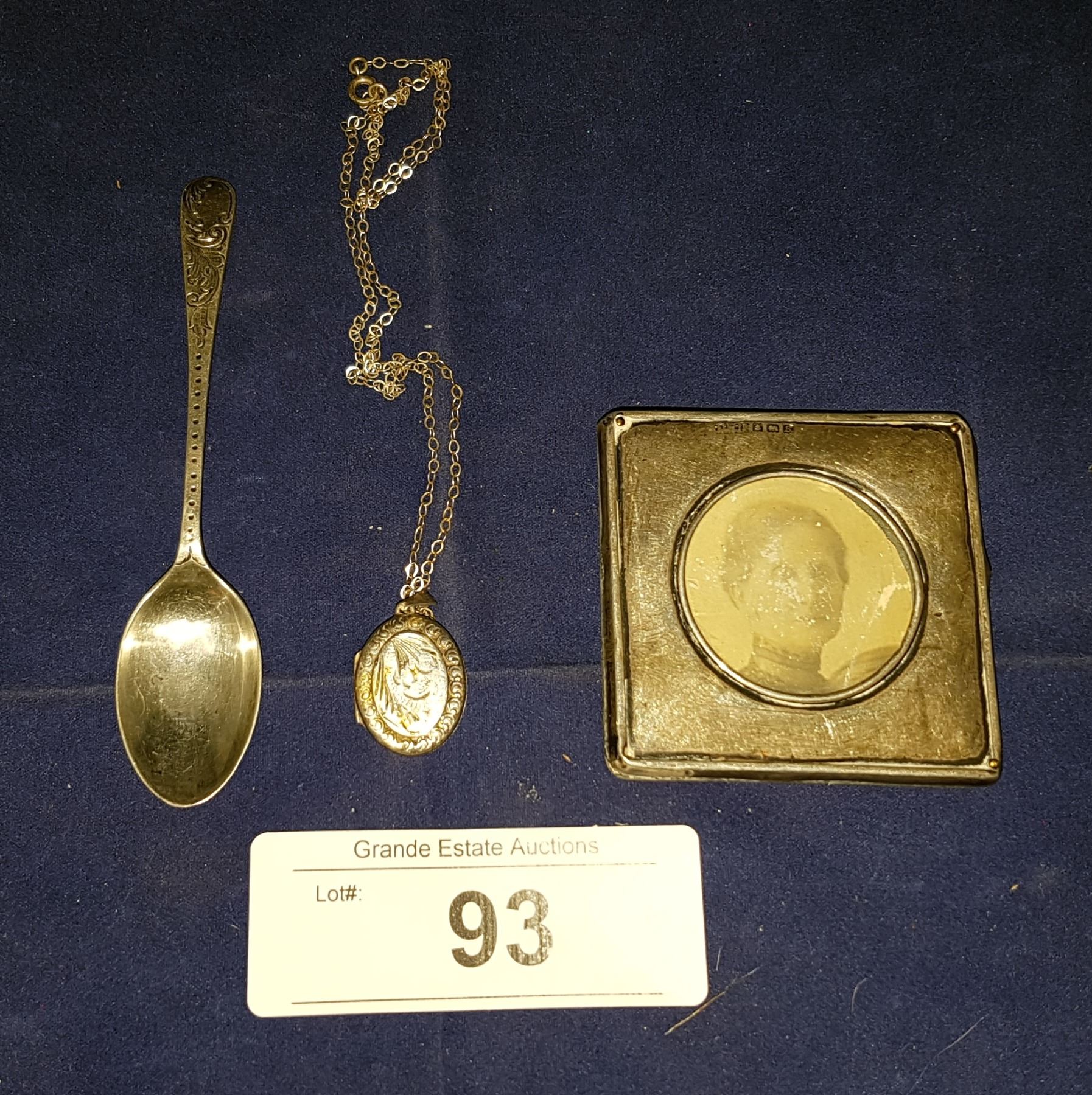 ANTIQUE STERLING SILVER PICTURE FRAME, LOCKET ON ORIGINAL CHAIN, & SPOON