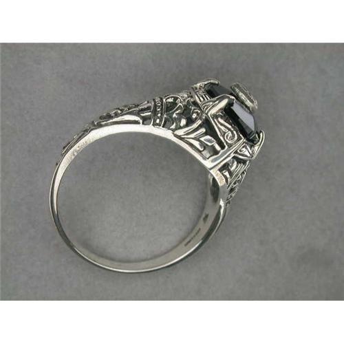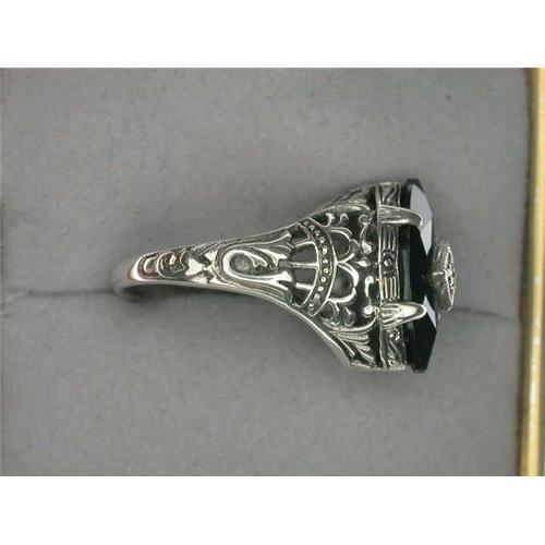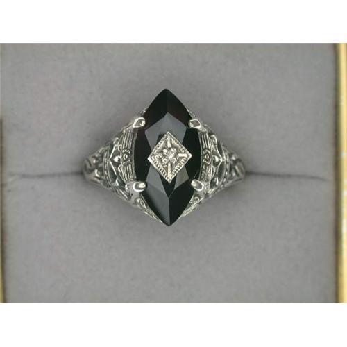 This Vintage Style ring magnificently reproduces the EXQUISITE FILIGREE work made popular in the 1930's - and THIS ring is in Mint condition! The ring is Solid STERLING Silver and it is set with a Marquise Cut Black Onyx with a Genuine Diamond in the center. This ring is a size 7 1/2, and I can easily resize it for you.