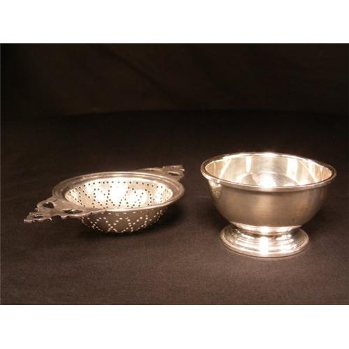 Lovely and rare to find is a sterling silver tea strainer WITH an under bowl! This is a gem for the tea lover! The set is clearly marked Sterling and is in wonderful condition. The overall measurements are 1.75 inches tall by 5 .5 inches long by 3 inches wide. The total weight is 3 .5 troy ounces. A beautiful find for your tea time collection or silver collection
