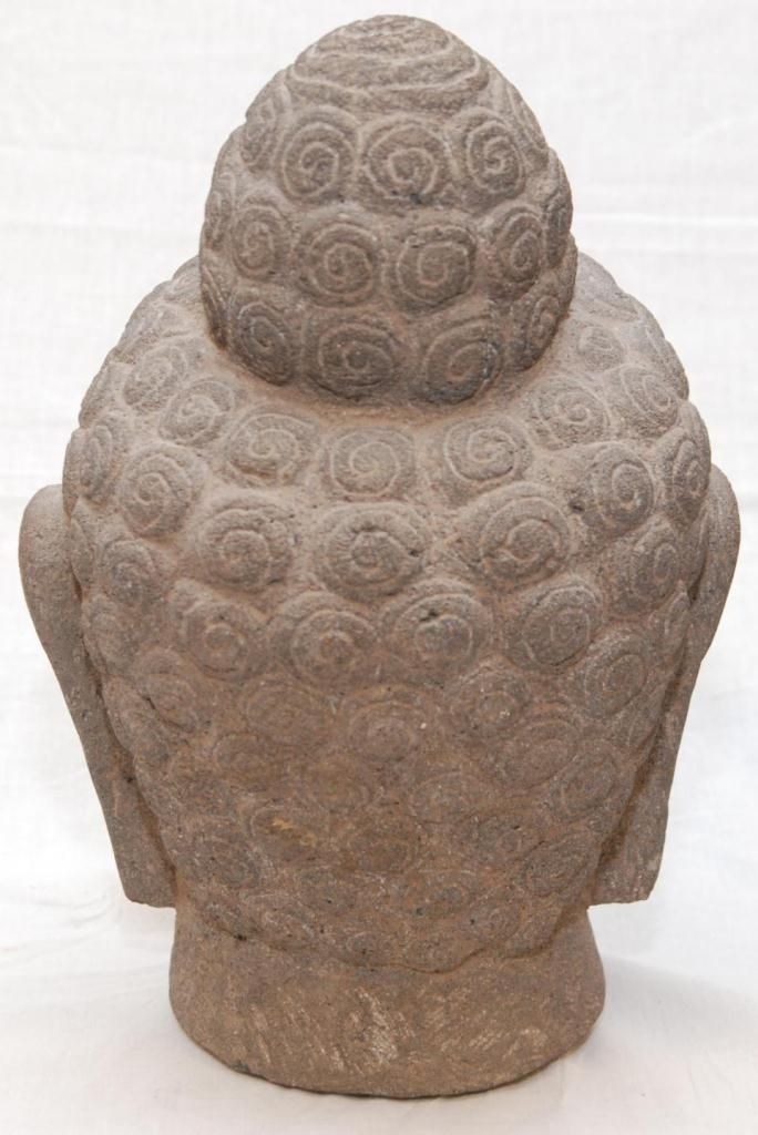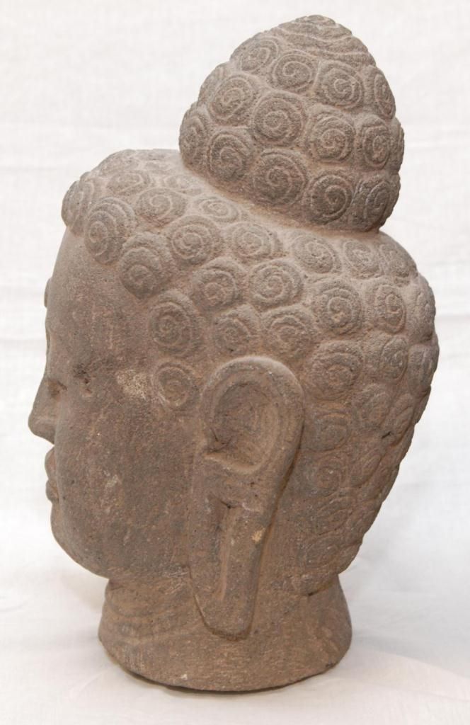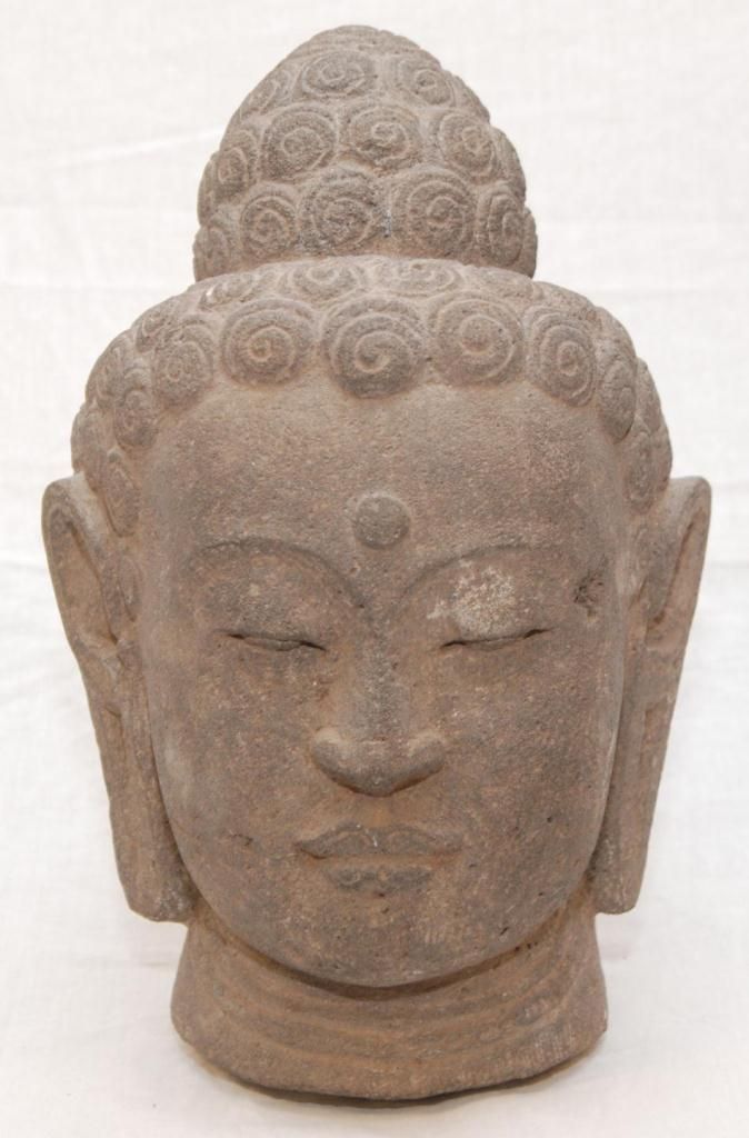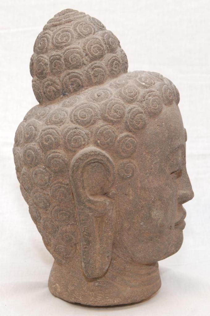 An antique Chinese carved stone figural buddha head sculptures. Sits on fitted wooden base. Qing dynasty period (1644–1912). Measures 12" height + 6 5/8" base height (30.5cm + 16.8cm). Total weight of 14.72 kilograms.