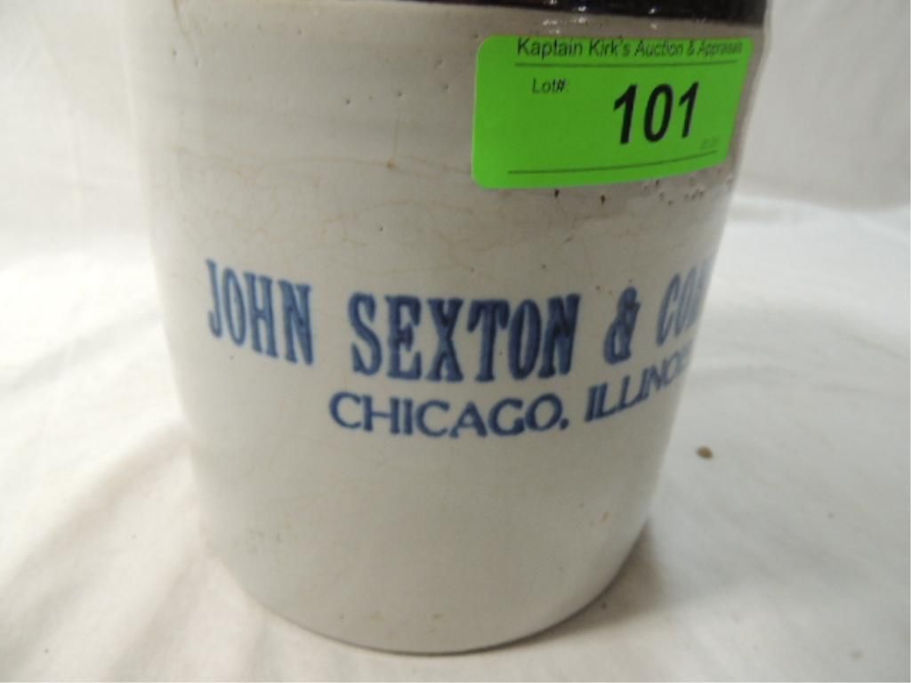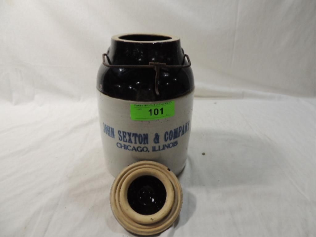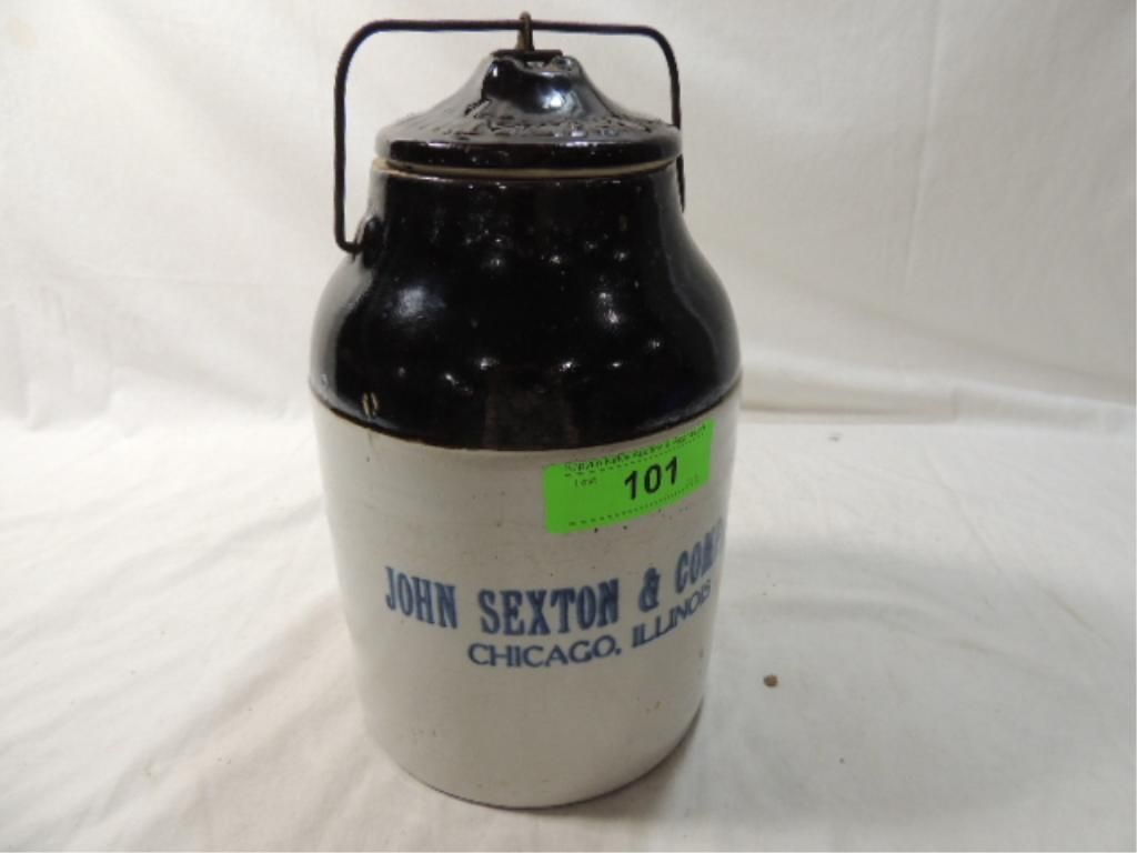 ANTIQUE STONEWARE CROCK CANNING JAR WITH LID AND BAIL LOCK. BROWN COUNTRY KITCHEN PRIMITIVE JOHN SEXTON & COMPANY CHICAGO, ILLINOIS. AS SHOWN SEE PHOTO FOR MORE DETAILS.