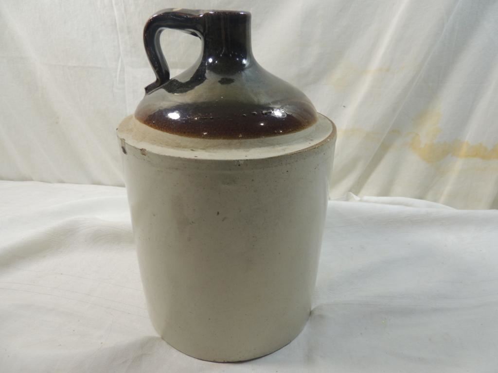 STONEWARE JUG, ANTIQUE JUG, MOONSHINE JUG, PRIMITIVE JUG, AS SHOWN SEE PHOTO FOR MORE DETAILS.