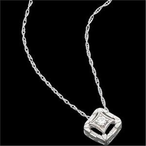 Antique Style 14k White Gold Necklace featuring a Diamond Pendant Slide on a 14k White Gold Rope Chain that is 18 inches in length. The Diamond = .05 Carats. This Diamond Necklace is in Brand New condition.