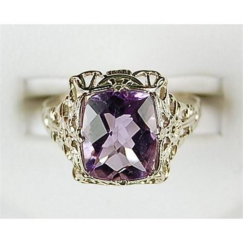 This Antique Style Ring is an Authentic and Accurate copy of a ring from the 1930s and THIS ring is in MINT condition. It is 14k White Gold and it features intricate FILIGREE work surrounding the GENUINE AMETHYST. The Amethyst is Cushion Cut and weighs THREE CARATS! This ring is a Size 6 and it can be resized.