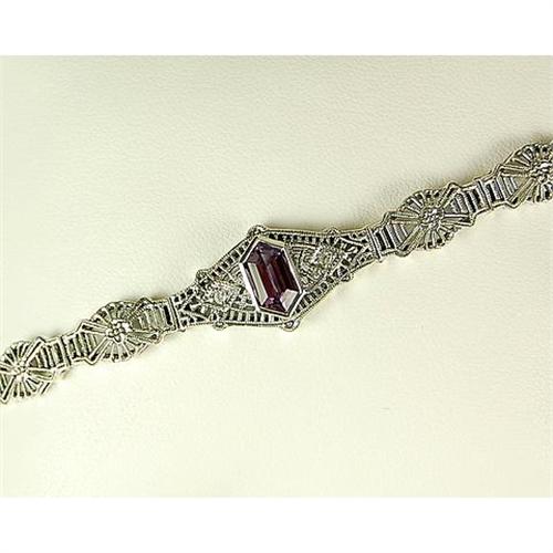 This Vintage Style bracelet from my collection is an Authentic & Accurate copy of a bracelet from the 1930's - and this one is in Mint condition! Vintage Style Sterling Silver bracelet featuring a 6 sided Genuine Amethyst with a Diamond set each side. The bracelet is 7" long and features exquisite filigreed links.