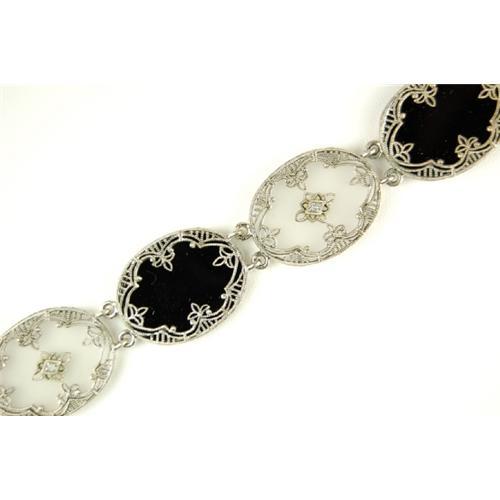 This VINTAGE Style Bracelet from my collection Authentically and Accurately reproduces the Outstanding 'Filigree' work made popular in the 1930's. This beautiful bracelet is all STERLING Silver and it features 3 Oval Black Onyx alternating with 3 Oval Crystal. The Crystals are each set with a center Diamond. Both the Black Onyx and the Crystal measure 20mm x 26mm, and they are each surrounded by Exquisite filigree work. The bracelet is 7" in length, has a very secure box clasp, and is in Mint condition. I HIGHLY RECOMMEND THIS BEAUTIFUL BRACELET TO YOU!