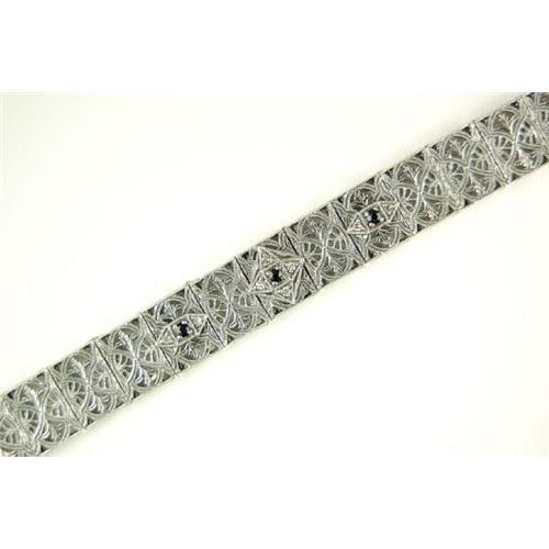 This Vintage Style Bracelet features some of the most OUTSTANDING FILIGREE work that I have seen! It is an Authentic & Accurate copy of a bracelet from the 1930's - and - this one is in Mint condition! It is a Solid STERLING SILVER Filigree Bracelet set with 3 Genuine Sapphires AND 6 Diamonds. This bracelet is 7" in length and 1/2" wide and it is truly Stunning!