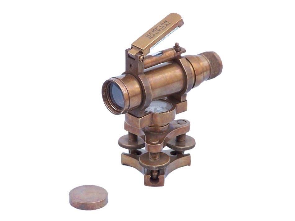 ANTIQUE STYLE BRASS 5" TOP BUBBLE DUMPY **|**|** The Hampton Nautical Antique Brass Dumpy Level (also known as an Engineer's Transit) is an instrument of impressive quality and craftsmanship. The Dumpy Level has a 20-power inverting telescope with precision crosshairs and two focusing adjustments. An adjustable spirit level with a protective cover is located on the top of the brass telescope. On the inside of the cover is a mirror to assist in reading the spirit level. There are three leveling adjustments on the base and it is threaded for a surveyor's tripod mount.