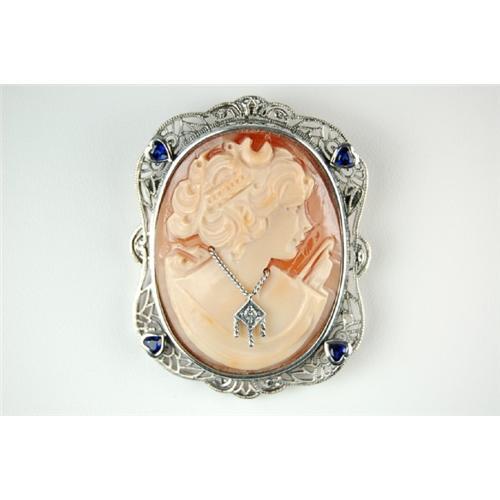 This ANTIQUE Style CAMEO Pin and Pendant is an AUTHENTIC & ACCURATE copy of a Pin from the 1920's but THIS one is in MINT condition. The Oval CAMEO features the profile of a young lady looking to her left. She is wearing a beautiful Necklace set with a DIAMOND. There are 4 Heartshaped BLUE SAPPHIRES set in the FILIGREE work surrounding the Cameo. This Pin Pendant measures 2 inches by 1 1/2 inches.