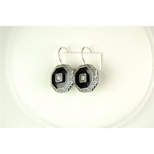 This pair of ANTIQUE Style Earrings is an Authentic and Accurate copy of a pair from the 1930's but THIS pair is in MINT condition. They are STERLING SILVER and each Earring features a hexagonal BLACK ONYX with a center DIAMOND. The Black Onyx is surrounded by very beautiful engraving. The Earrings measure 1/2 inch across.
