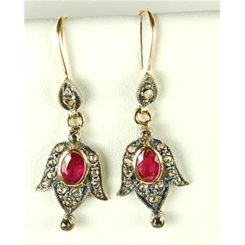 This pair of ANTIQUE Style Earrings are an AUTHENTIC and ACCURATE copy of a pair from the early 1900's but THIS pair is in MINT condition. Each Earring features an Oval RUBY accented by Rose Cut DIAMONDS, and suspended from 14K GOLD Earwires. The Earrings measure 1.5" from the top of the Gold earwire to the bottom of the Earring.