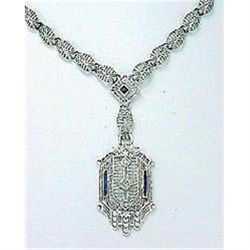 Vintage Style Sterling Silver Filigree Necklace with Sapphires and Diamonds - Vintage Style Drop Pendant. Necklace measures 16 inches in length x 1/4 inches W and pendant measures 3/4 inches W x 2 1/4 inches H.