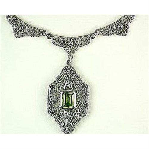 This Antique Style Necklace is an Authentic and Accurate copy of a Necklace from the 1930s and THIS one is in MINT condition! It is STERLING SILVER and it features a rectangular PERIDOT = ONE CARAT surrounded by outstanding and authentic FILIGREE work. The Necklace measures 22 inches from the clasp to the tip of the pendant.