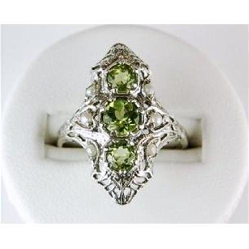 This ANTIQUE Style ring is an AUTHENTIC and ACCURATE copy of a ring from 1925 but THIS one is in MINT condition! It is STERLING SILVER and it features THREE beautiful Genuine PERIDOTs = 1.25 CARATs! The PERIDOTS are surrounded by very beautiful filigree work that was typical of the 1920's. It is a Size 8 and it can be resized either larger or smaller.